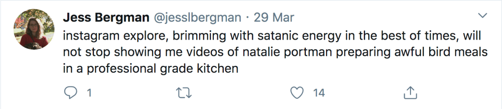 Later on Twitter I see Ms. Portman is interrupting the lives of others. @jesslbergman ‘instagram explore, brimming with satanic energy in the best of times, will not stop showing me videos of natalie portman preparing awful bird meals in a professional grade kitchen’