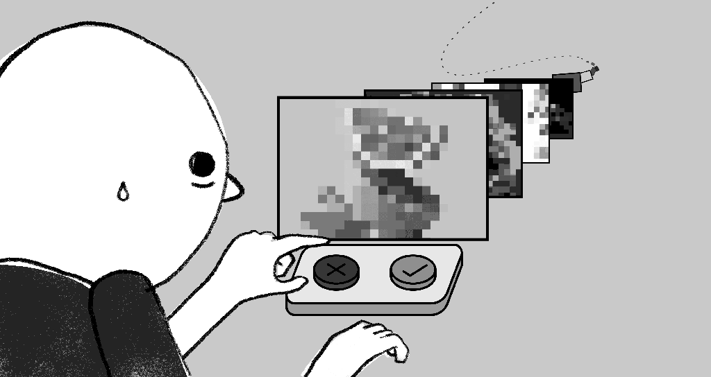 Content moderators are at once policing, as they are being policed. They manually decide if disturbing content (frequently viewed in greyscale to ‘reduce’ the vividness of the trauma witnessed) is too disturbing to be made public, whilst allowed minimal breaks and closely monitored by supervisors, not over their mental health but the amount of content pieces they are getting through per day (100-300 is the average for YouTube mods), and in regulation of their breaks–from ‘toilet time’ to lunch, and if they’re lucky, brief rest.