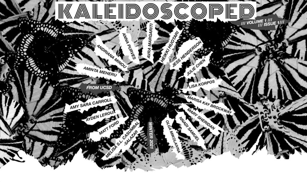 KALEIDOSCOPED is a new literary magazine formed at UC San Diego. The magazine is especially interested in publishing literary and visual art that makes use of cross-genre, hybrid, experimental, unusual, or fragmented forms, and in turn allows us to imagine the world from its creator’s unique position within it: to re-imagine what the world is, and what it might be. We hope to carve out space for works that don’t easily fit within academic and commercial publishing, including works by those who have never published before, those who don’t have a degree in the arts, or whose work shatters traditional notions of genre, time, and story.