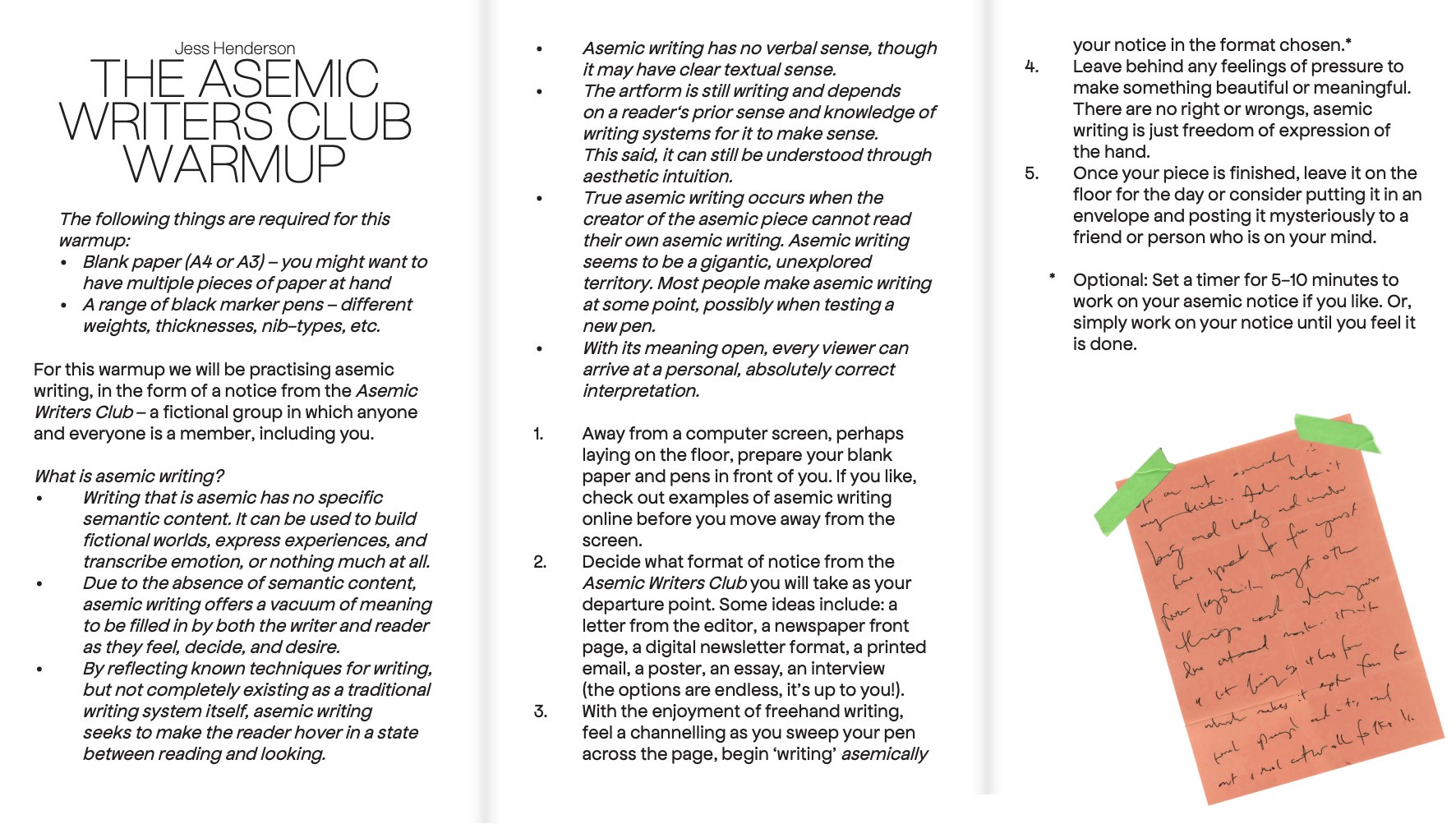 With asemic writing firmly in my own artistic practices, and useful as an artistic research device in discussion groups, when I was asked to contribute to a book of warm-up and cool-down exercises in relation to art making or group workshops, I created the ‘Asemic Writers Club’ warm-up, which can be read below.
