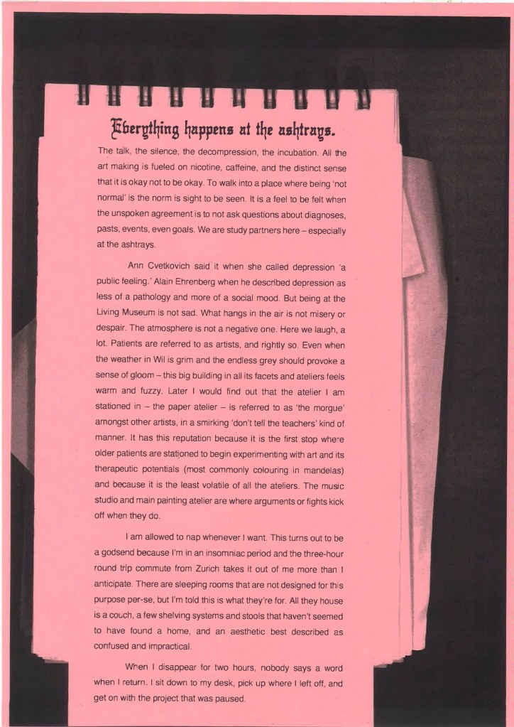 Arranged by Zurich University of the Arts’ (ZHdK) ‘Artists in Labs’ programme, I spent a semester in residency at Switzerland’s Living Museum Ateliers under the guidance of Dr. Nicole Ottiger for the purpose of artistic research, including practice-based, on burnout and exhaustion. The first Living Museum was established in the early 1980’s in Queens, New York City by Janos Marton, a Hungarian artist and psychologist, and Bolek Greczynski, an artist from Poland. Their concept lays at the intersection of psychiatry, mental health, and artistic production, offering workspaces and guidance for those experiencing mental health issues that is,